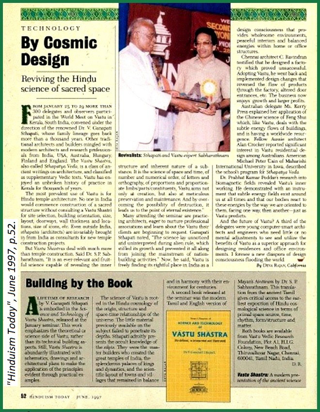 «Строительство согласно Книги. Время исследовательской жизни В.Ганапати Стхапати воплощено в «Науке и технологии Васту Шастры», опубликованной во время январского семинара. В этой работе придается особое значение теоретической или научной стороне Васту, а не ее техническим аспектам строительства. Тем не менее, Васту Шастра обильно проиллюстрирована схемами, чертежами и архитектурными планами, чтобы сделать применение принципов наглядным, на практических примерах. Происхождение науки Васту коренится в индуистской космологии, структуре и пространственно-временных связях Вселенной. Незначительный материал, ранее доступный на эту тему, не смог проникнуть в ее (науки Васту – А.К.) глубины. Стхапати умело представляет сокровенные знания о шильпинах. Они были главными строителями, которые создали великие храмы Индии, великолепные дворцы королей и династий, научную планировку городов и деревень, веками остававшихся в равновесии и гармонии с окружающей их средой. Второй книгой, выпущенной во время семинара, была современная тамильская и английская версия *«Аинтирама Майяна», доктора С.П.Сабхаратхама. Этот перевод с древнего тамильского языка, представляет критический подход к самому раннему изложению индуистской космологической науки в терминах первичного источника пространства, времени, ритма, формы/структуры и материи. Обе книги доступны в Ведическом исследовательском фонде Васту, участок А1, Х.И.Г. Колони, Нью Бич Роуд, Тируваллувар Нагар, Ченнай, 600041, Тамил Наду, Индия. (“Technology. Building by the Book/Hinduism Today”, June-1997, p.52).