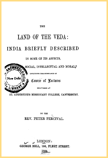 Заметный вклад в популяризацию индийской культуры внес преподобный Питер Персиваль (Peter Percival, 1803 – 1882), «Земля Вед: Индия, кратко описанная в некоторых ее аспектах, физических, социальных, интеллектуальных и моральных» и др.
