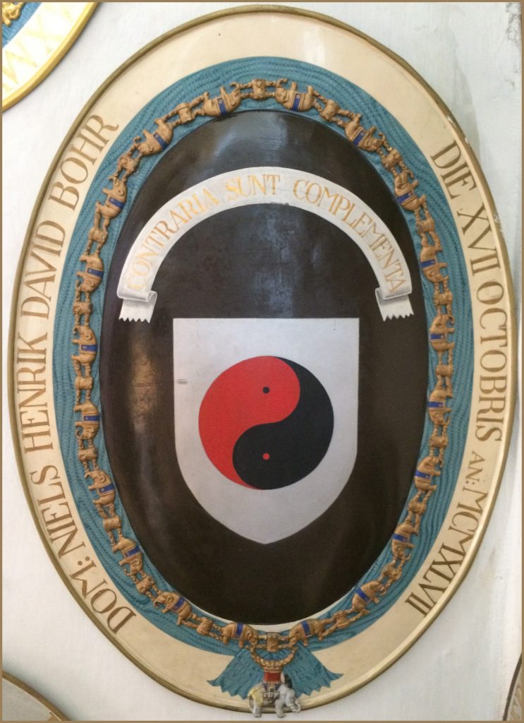 «*Нильс Бор хорошо знал о том, что его понятие дополнительности имеет соответствие в китайской философии. Посетив Китай в 1937 году, когда его трактовка квантовой теории была уже полностью разработана, он был глубоко поражен тем, что в древней китайской философии существовало понятие о полярных противоположностях: это обстоятельство оказало на него сильное воздействие, и впоследствии его интерес к восточной культуре никогда не угасал. Через десять лет Бору было пожаловано дворянское достоинство в знак признания его выдающихся научных достижений и важного участия в культурной жизни Дании, и когда ему нужно было избрать символ для герба, его выбор пал на китайский символ тайцзи, который выражает соотношение дополнительности между архетипическими противоположностями ИНЬ и ЯН. Выбирая этот символ для своего герба вместе с изречением: “Contraria sunt complementa” («Противоположности дополняют друг друга»), Нильс Бор признал существование глубокого единства древней восточной мудрости и современной западной науки». («Дао физики: Общие корни современной физики и восточного мистицизма», Капра Фритьоф, М-2008, стр. 183). *Нильс Бор —  Бор Нильс Хендрик Давид (1885—1962), датский физик-теоретик. Нобелевская премия (1922г.) – за разработку квантовой теории планетарного атома.