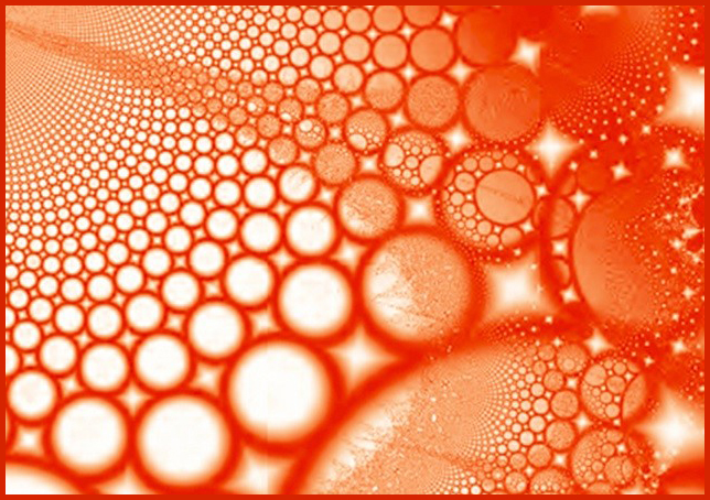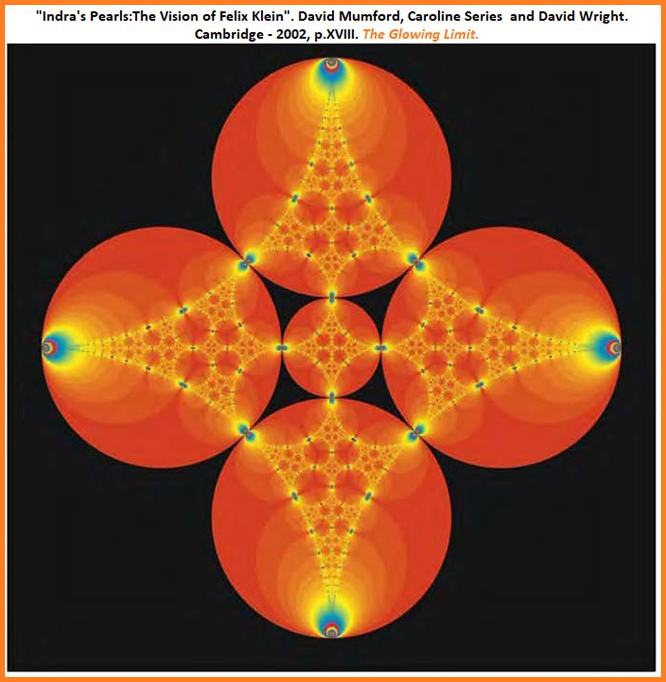 Этой ассоциацией мы косвенно обязаны *Майклу Берри: упоминание о том, что в «Сутре Хуаянь» рассказывается о жемчужинах Индры, мы обнаружили в одной из его статей о хаосе. Как и на обложке нашей книги, жемчужины в сети Индры отражают друг друга, причем сами отражения содержат не только другие жемчужины, но и отражения других жемчужин. Таким образом, вся вселенная видна не только в каждой жемчужине, но и в каждом отражении каждой жемчужины, и так ad infinitum*. В ходе дальнейших исследований мы обнаружили, что вся математическая конструкция Клейна, включающая одинаковые структуры, бесконечно повторяющиеся друг в друге во все уменьшающемся масштабе, удивительным образом воспроизводит философию и образы «Аватамсака-сутры». Как пишет Ф. Кук в своей книге «Буддизм Хуаянь: драгоценная сеть Индры»: «В школе Хуаянь очень любили этот образ, неоднократно упоминающийся в текстах школы; он символизирует космос, в котором между всеми его элементами есть бесконечно повторяющиеся связи. Считается, что подобная взаимосвязь выражает одновременно взаимное тождество и взаимную обусловленность. По словам сэра **Чарльза Элиота: «Таким же образом каждый объект в мире есть не просто он сам, он включает в себя любой другой объект и по существу является любым другим объектом». Формулируя утверждение, одинаково верное как для математики, так и для религии, можно сказать, что каждая часть любого из наших рисунков содержит в себе суть целого. Возможно, создавая рисунок «сияющего предела», мы слишком увлеклись этой аналогией. Цвета в нем подобраны таким образом, что точки скопления мельчайших фрагментов мозаики излучают таинственное сияние. Следуя философии «Аватамсака сутры» и все сильнее увеличивая изображение (вы сможете это делать, вы будете наблюдать все ту же кружевную структуру, повторяющую себя на все более и более тонком уровне, миры внутри миров внутри миров. Сияющий предел. Эта иллюстрация следует мантре Жемчужин Индры ad infinitum* (настолько насколько позволяют возможности компьютера). Исходный рисунок содержал лишь пять соприкасающихся красных кругов, и сияющее желтое кружево возникает из него самопроизвольно. Сияющий узор — фрактал, являющийся «предельным множеством» одной из симметричных итеративных процедур Клейна. Объяснению того, как следует понимать и рисовать такие предельные множества, и посвящена эта книга. Как и многие другие математики, мы часто испытывали досаду от невозможности передать волнение, азарт и радость творчества, сопутствующие нашей работе. Мы надеемся, что наша книга поможет хоть немного справиться с этой проблемой. На каком бы уровне вы ни решили ее читать — только просмотреть картинки, прочитать отдельные места, самостоятельно повозиться с формулами или же создать свою собственную компьютерную лабораторию, мы будем считать свою задачу выполненной, если нам удастся передать хотя бы часть красоты, которую мы видим, и восторга, который мы ощущаем, исследуя эту данную Богом, но созданную человеком вселенную под названием математика».  («Ожерелье Индры. Видение Феликса Клейна», Мамфорд Д., Райт Д., Сирис К., рис. Ларри Гоника. Пер. с англ. под ред. О. В. Шварцмана, М-2011, стр. XXI-XXIY и “Indra’s Pearls. The vision of Felix Klein”, David Mumford, Caroline Series, David Wright, with cartoons by Larry Gonick.  Cambridge – 2002).  **ad infinitum – до бесконечности.