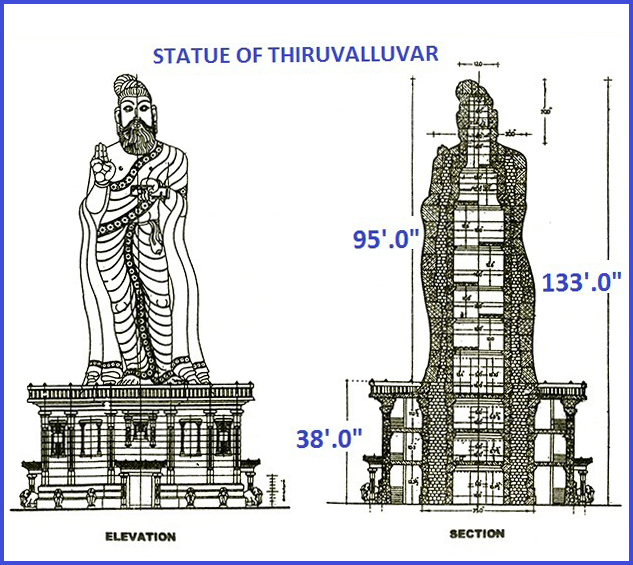 «На рисунке статуи, 38-ми футовый пьедестал изображает первые 38 глав, посвященных добродетели, а сама статуя в 95 футов изображает остальные 95 глав, посвященных богатству и любви в мирской жизни. Извечное послание о том, что достижение богатства и любви должно основываться на истине и добродетели, хорошо отражено в структурном оформлении статуи. Правая рука статуи, жестом изображает основные главы Тирукурала, а именно: добродетель, богатство и любовь, а левая рука держит манускрипт из пальмового листа, который повернут выгравированным на нем именем «Тирукурал». (“The colossal statue of Ayyan Thiruvalluvar. Kanyakumari, India”,”A Shilpi speaks series-16”, Chennai – 2003, p.4-5).